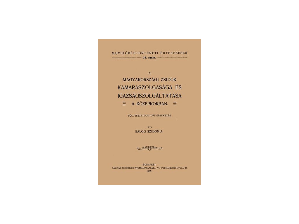 IV. Béla király 1251-ben kiadott privilégiuma közvetlen királyi védelem alá helyezte a Királyság területén élő zsidókat, s a kamara szolgáinak nyilvánította őket. Ily módon a zsidók világi pereiben a király által kinevezett zsidó bíró ítélkezett, amíg a vallást érintő kérdésekben saját bíróságuk döntött. A kötet a zsidókkal kapcsolatos jogi kérdésekkel foglalkozik a középkor folyamán. Művelődéstörténeti értekezések című sorozat. 28. Budapest, Hornyánszky nyomda. 1907. Hasonmás kiadás.Kiegészítő paraméterek