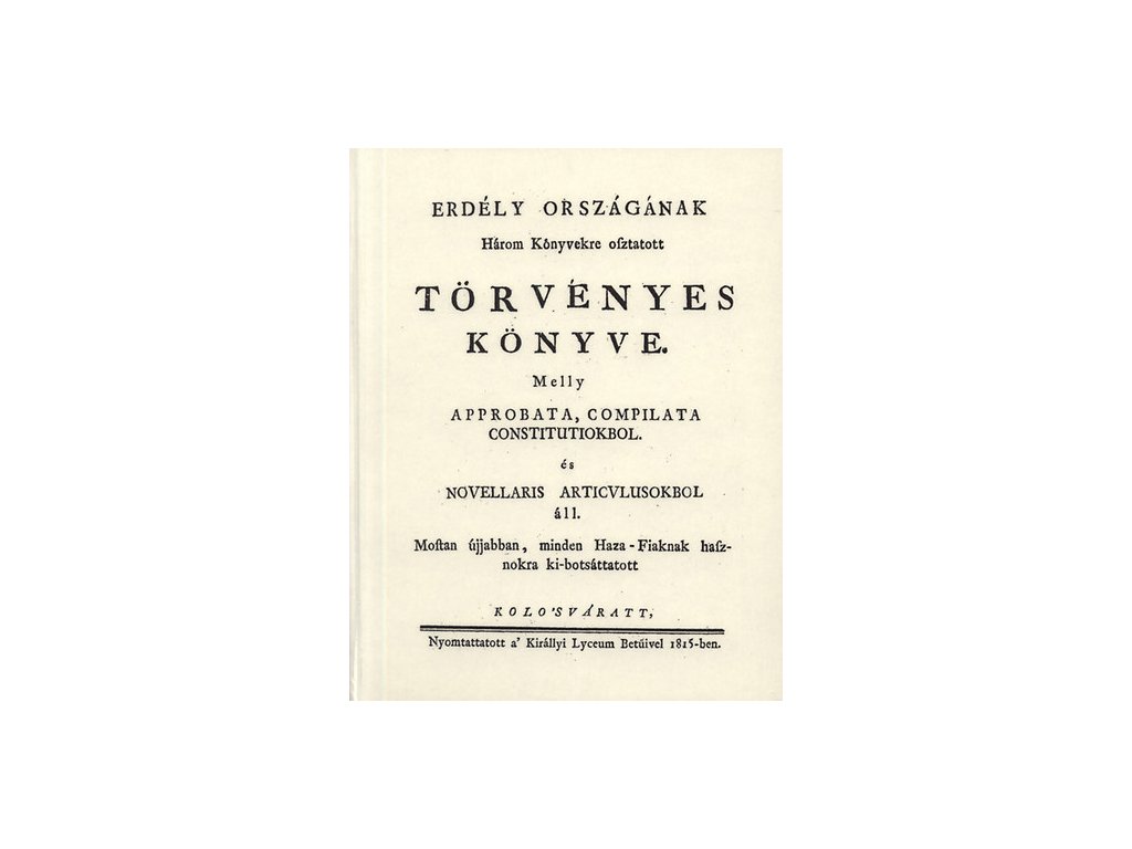 Az erdélyi törvénykönyv első kiadása 1779. egy kötetben jelent meg Erdély országának három könyvekre osztatott Törvényes könyve címen, mely azonban a címtől eltérőleg nem 3, hanem 4 könyvből áll, ú. m.: 1. az approbáták; 2. a kompiláták; 3. az articuli novellares; 4. a szász nemzetnek municipalis statutumai.Kiegészítő paraméterek